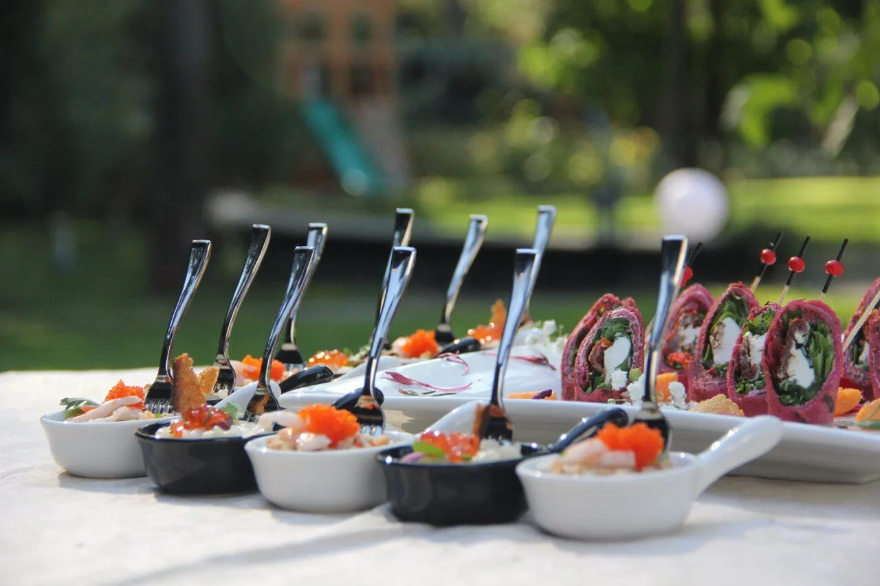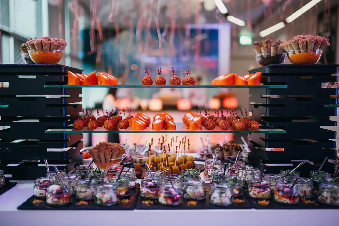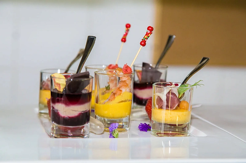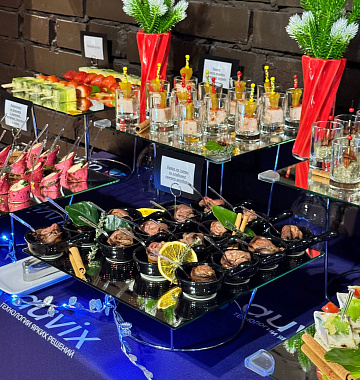 фуршетные и коктейльные форматы, тёплые мини-позиции и например, горячие закуски на шпажках, которые можно есть в удобном ритме.