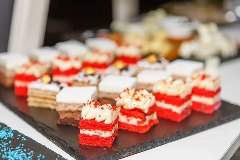 Закуски с говядиной, цыпленком, ветчиной, салом, сельдью, крабом. Трио круассанов с тунцом, говядиной, мини-моцареллой. Десертная композиция состоит из медовика, праги, панна-котты