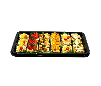 Самый простой вариант — взять по 1 кг рыбного, мясного, сырного и овощного ассорти. В этом случае каждый гость точно сможет выбрать, чем ему перекусить. Если хочется что-то пооригинальнее — пару нарезок можно заменить на веррины, брускетты, канапе и другие порционные закуски.