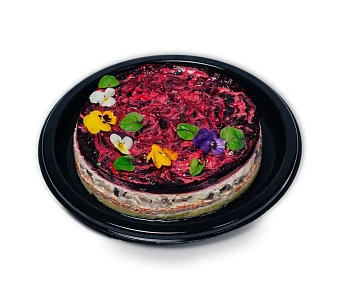 Салаты "Сельдь под шубой", "Оливье", салат с чёрной треской, закуски из морского гребешка, чёрной трески, куриных рулетиков, пряной сельди, лосося, овощей с мятой