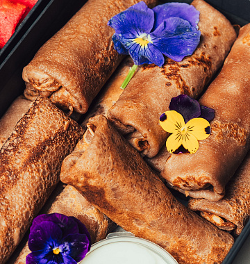 Мясные блины уверенно лидируют по популярности. Говядина, курица или классический фарш с луком и специями — формат, который одинаково хорошо работает и на фуршете, и на деловом завтраке.