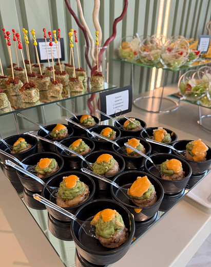 Комбинация холодных закусок, мини-сэндвичей и порционных форматов позволяет закрыть потребности гостей с разными предпочтениями.