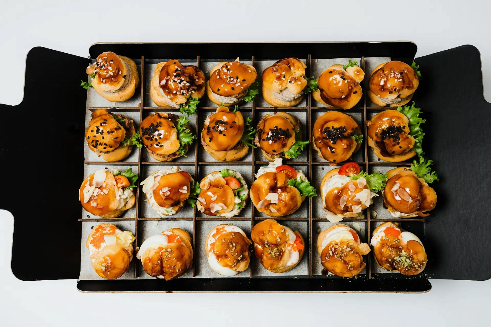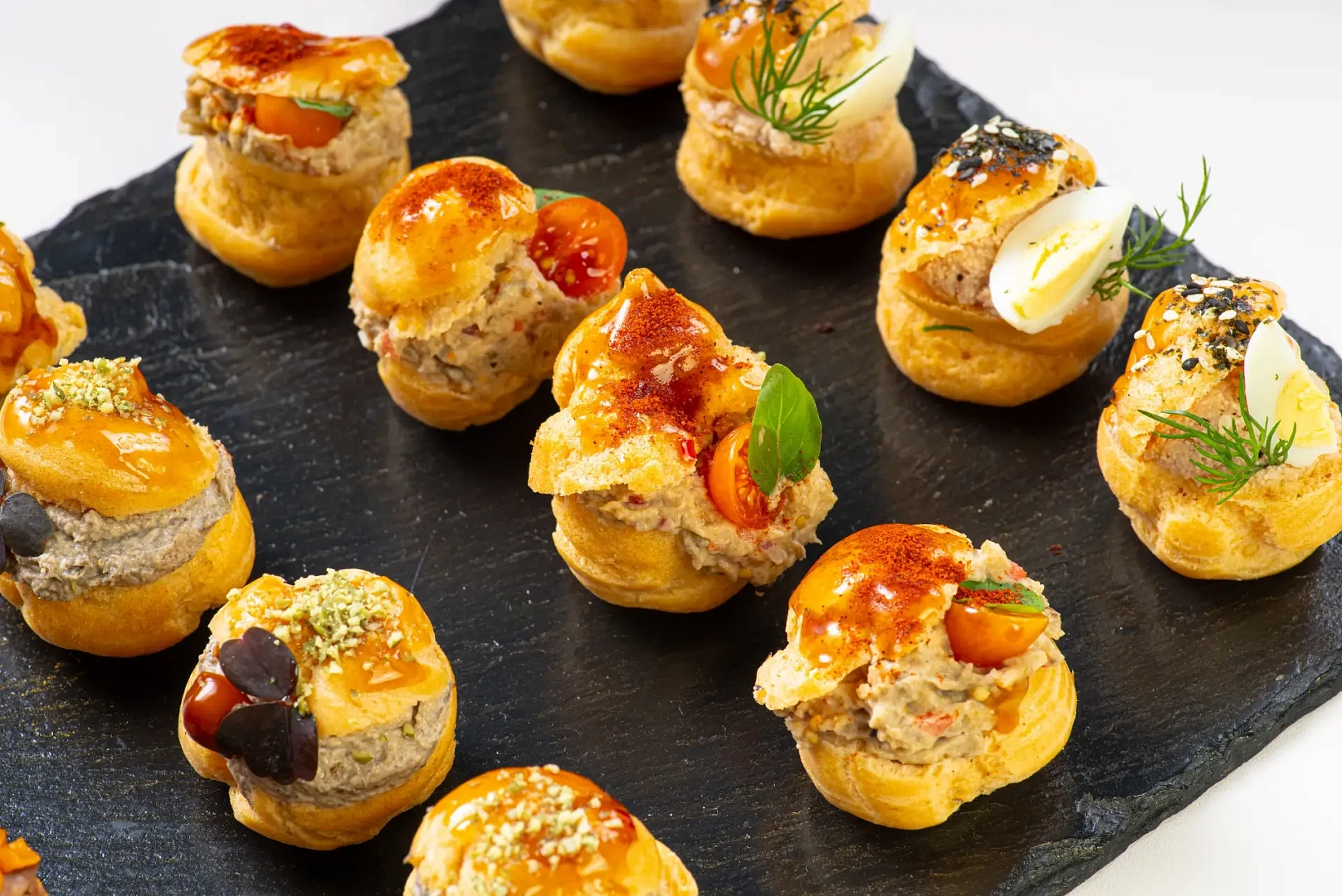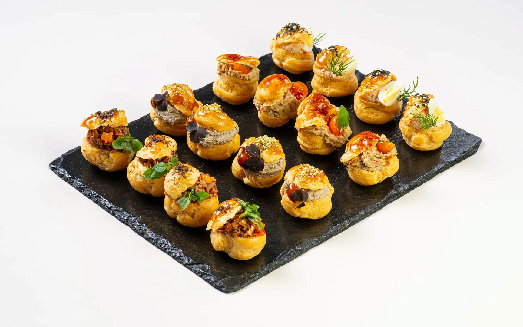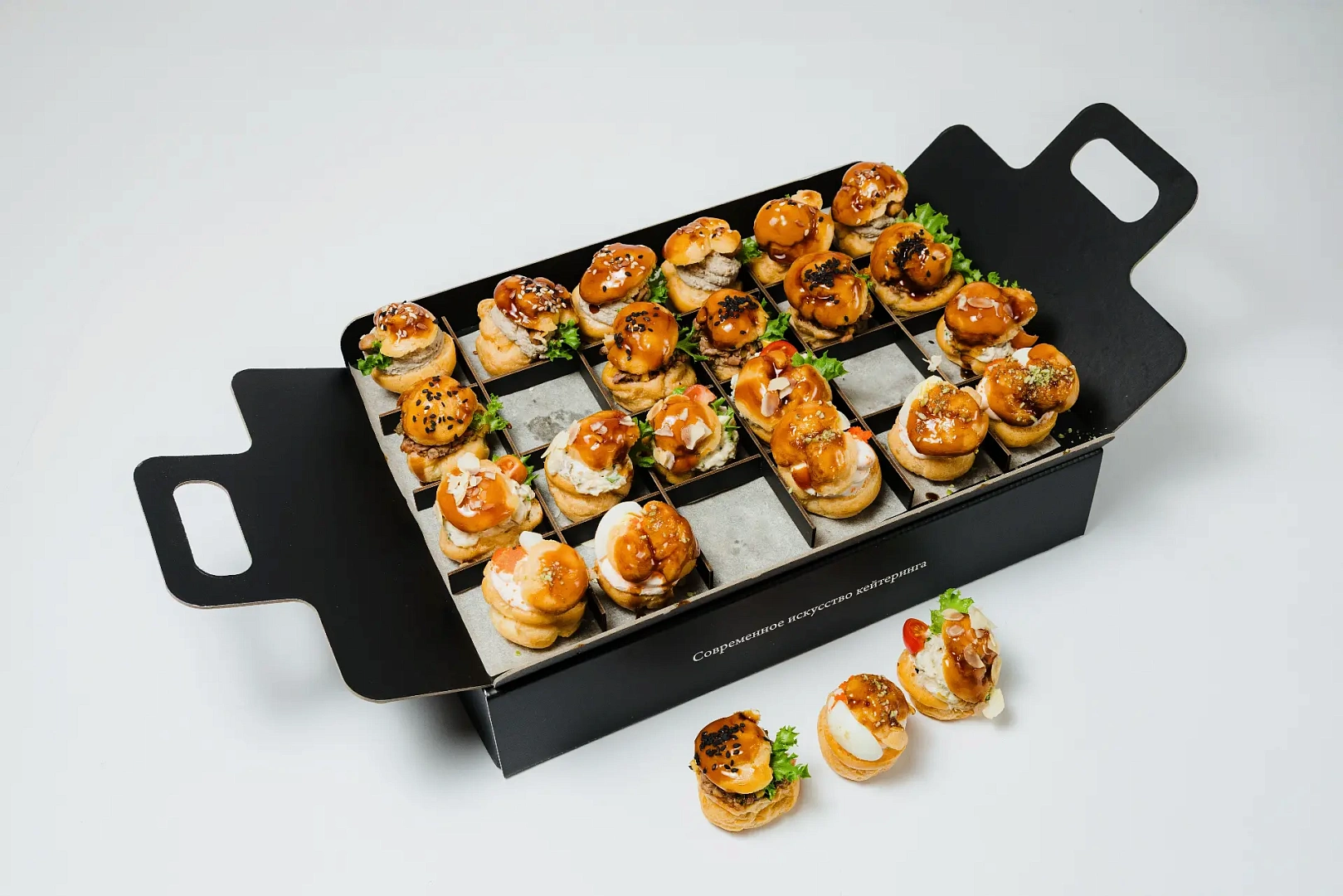 Профитроли — это классика французской кухни, которая никого не оставит равнодушным. Набор из профитролей с нежным грибным муссом, икрой из баклажан, икрой трески и говядиной с тыквой, станет хорошим дополнением любого мероприятия. Ассорти подойдёт для фуршета на природе, в офисе или дома.