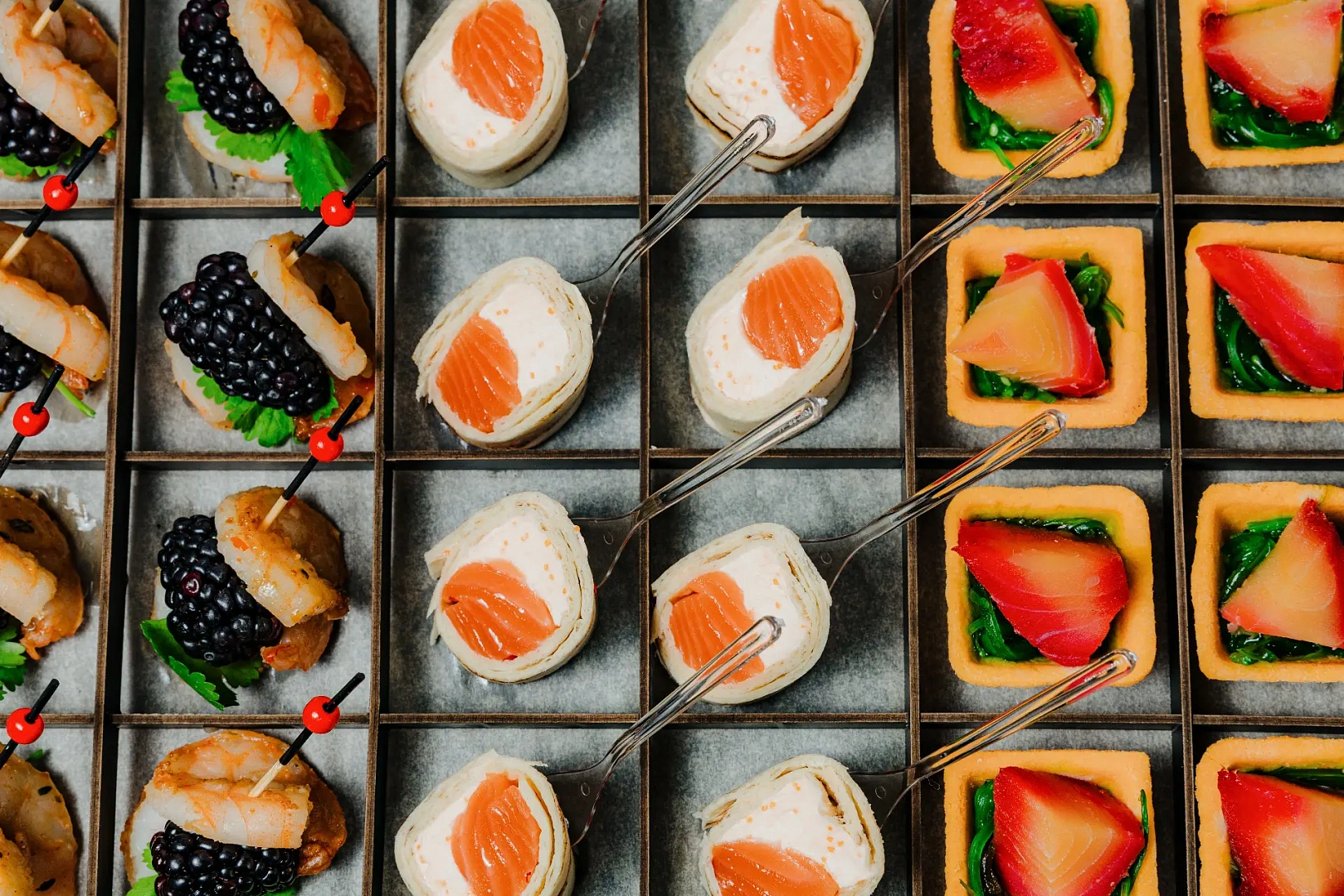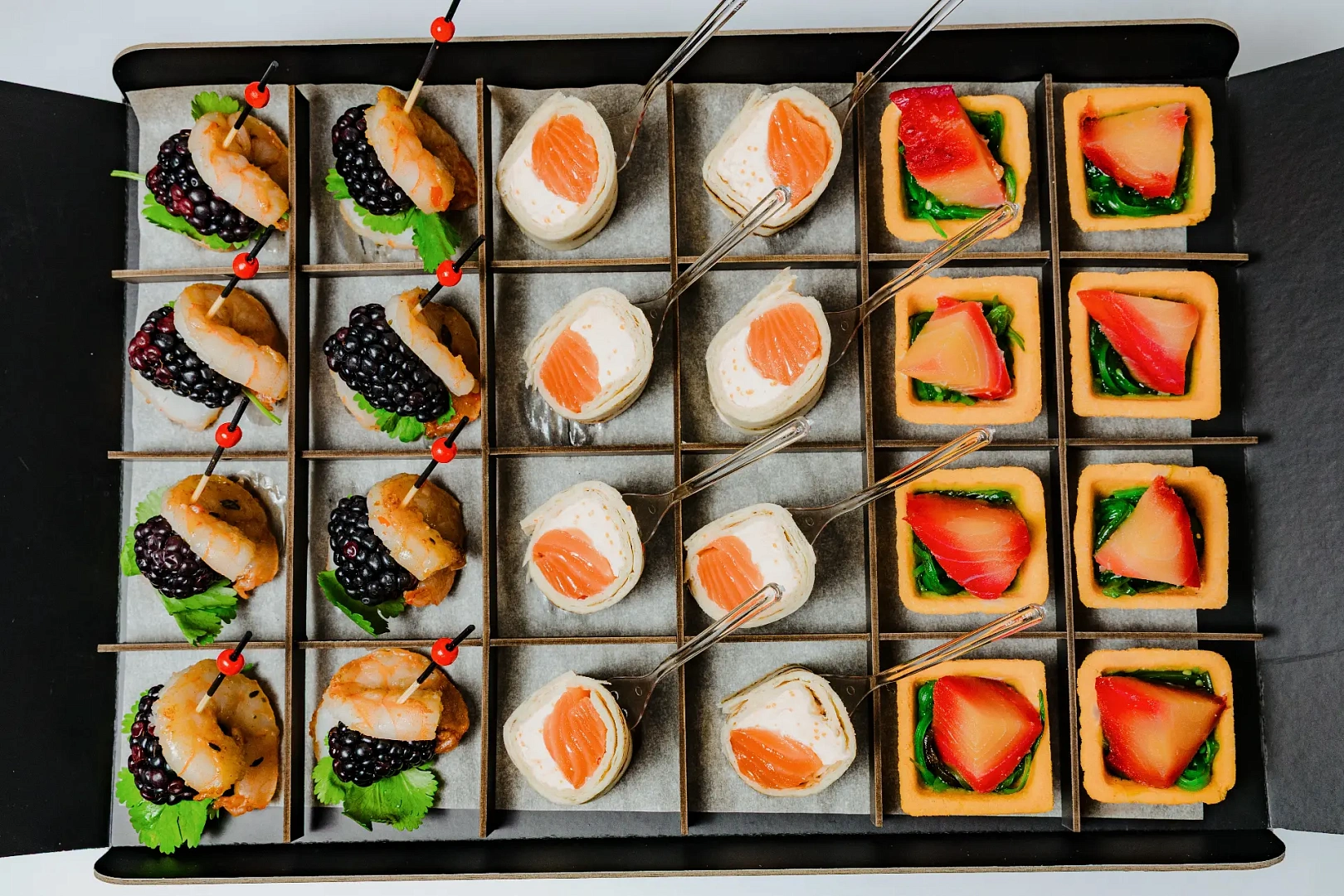 Любите морепродукты? Тогда фуршетный набор «Лагуна» покорит ваше сердце! В его составе канапе с тигровой креветкой и ежевикой, авторский мексиканский ролл с лососем и оригинальные тарталетки с филе клыкача и салатом чука.