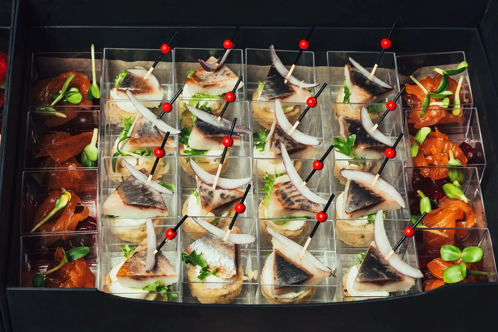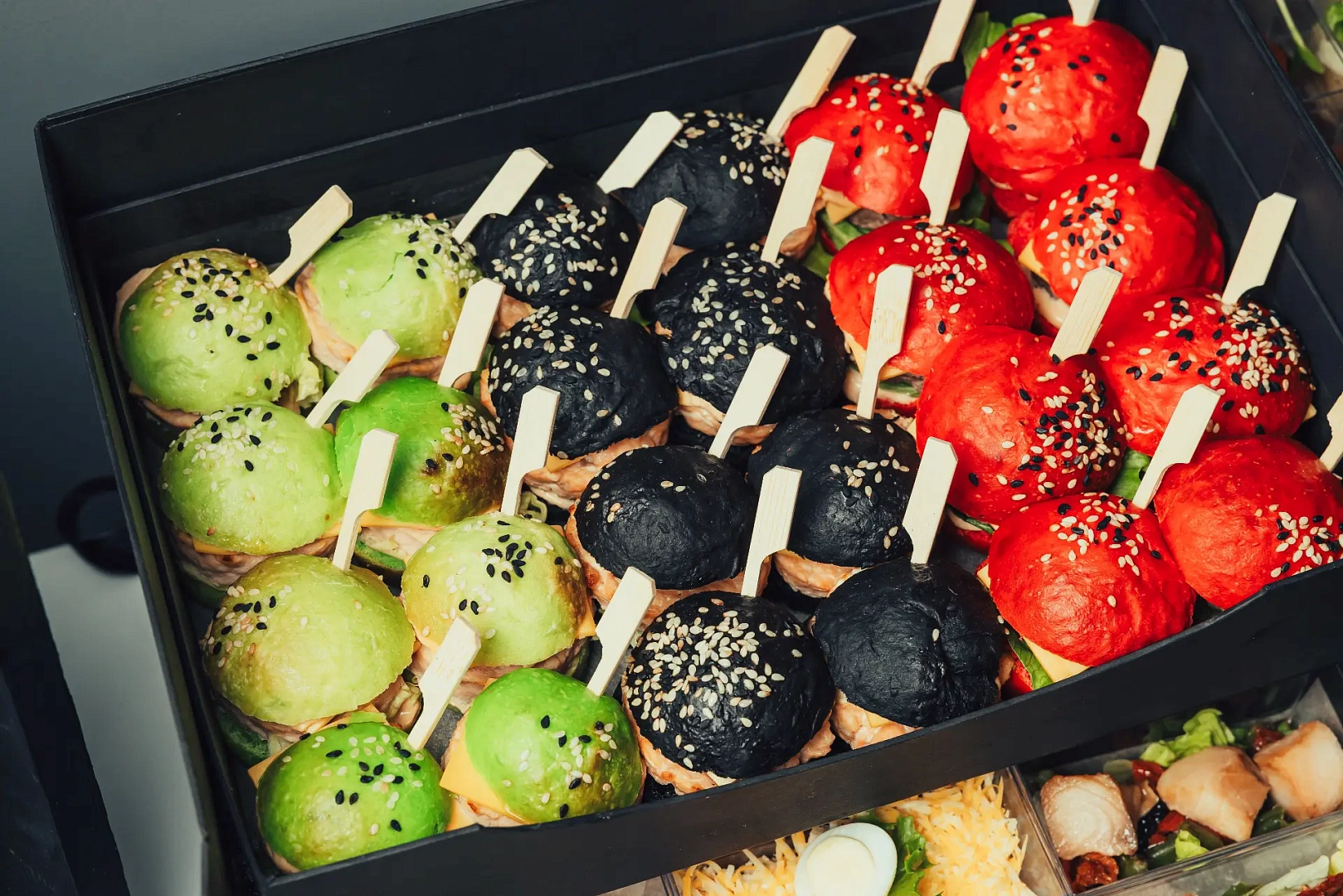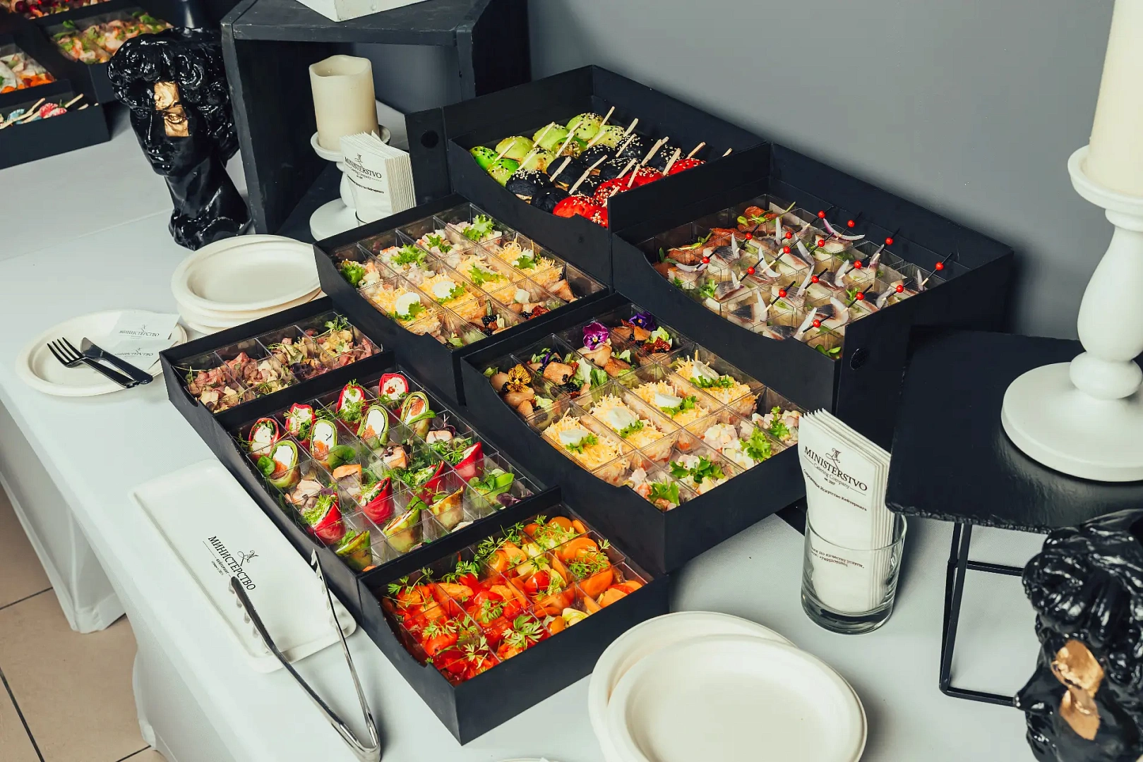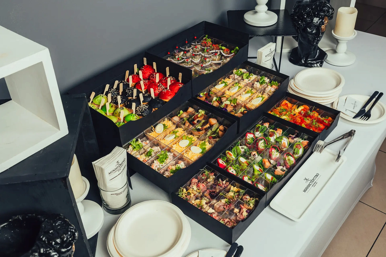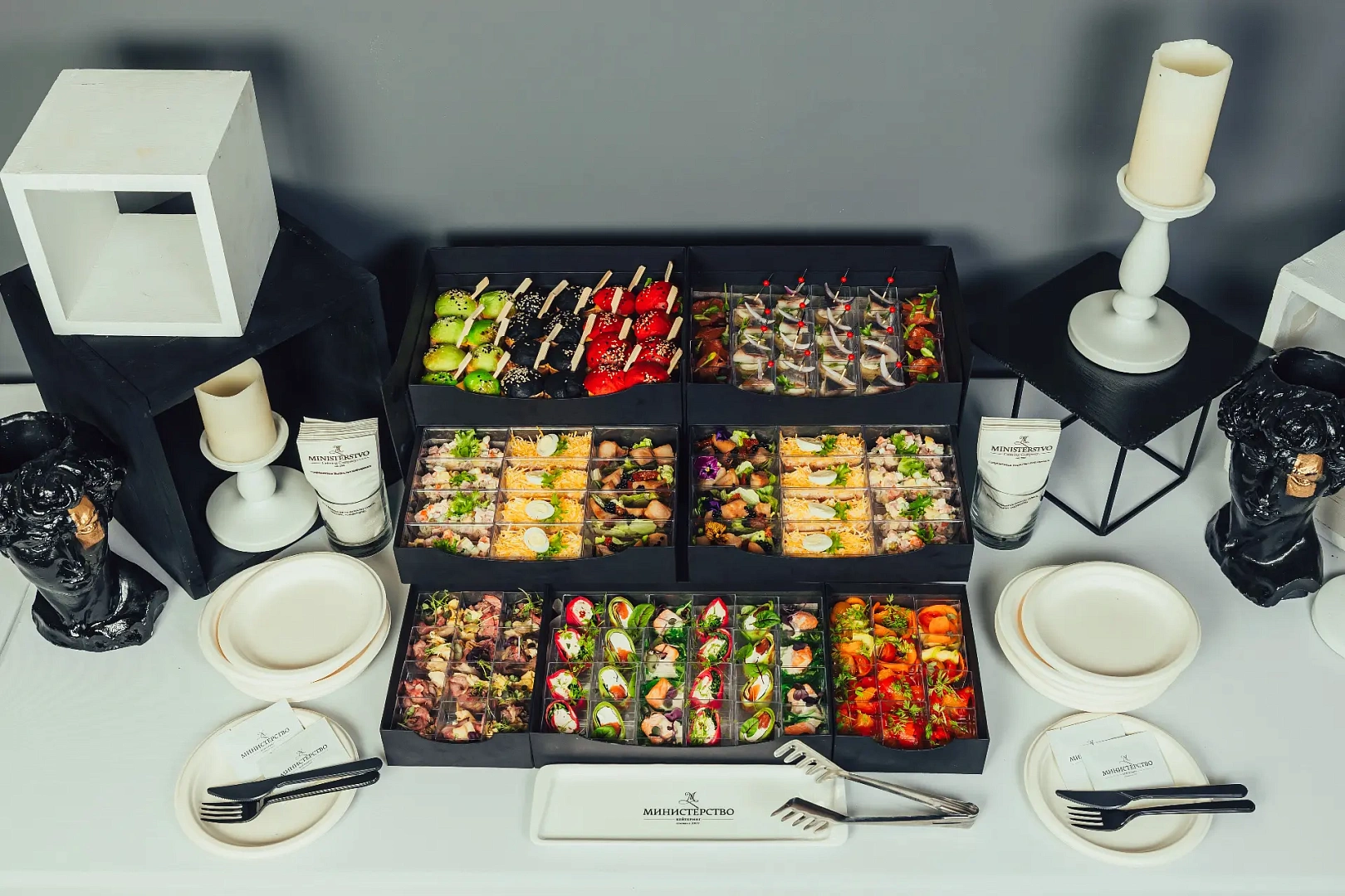 Образ Ильи Муромца — героя русского эпоса и живописи Виктора Васнецова — здесь раскрывается через сытные, выразительные позиции: мини-бургеры с мясными и рыбными котлетами, говядина с артишоками, лосось в тайском стиле, печёная чёрная треска, классические салаты и пряные закуски. Набор собран как основательный фуршет с характером — мощный по вкусу, разнообразный по подаче и выверенный по балансу.
