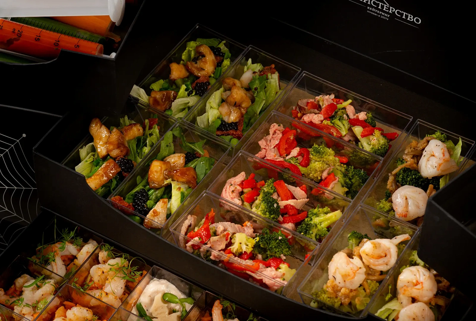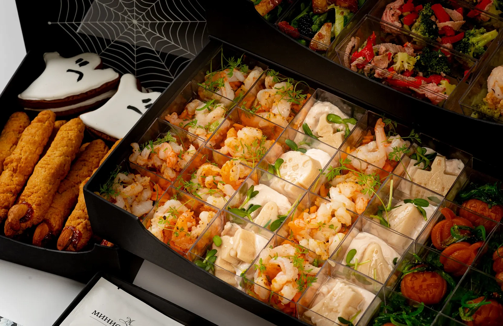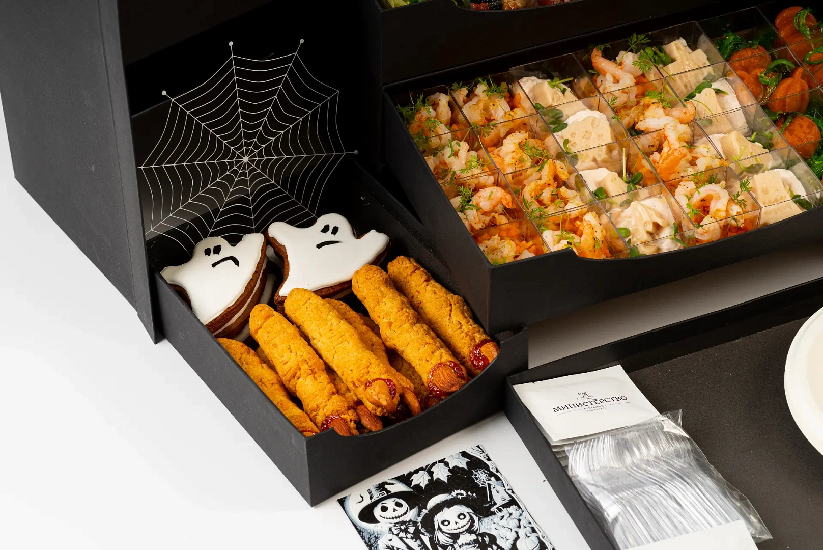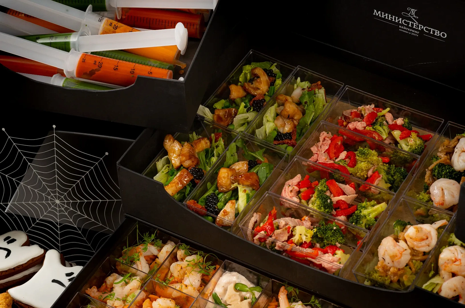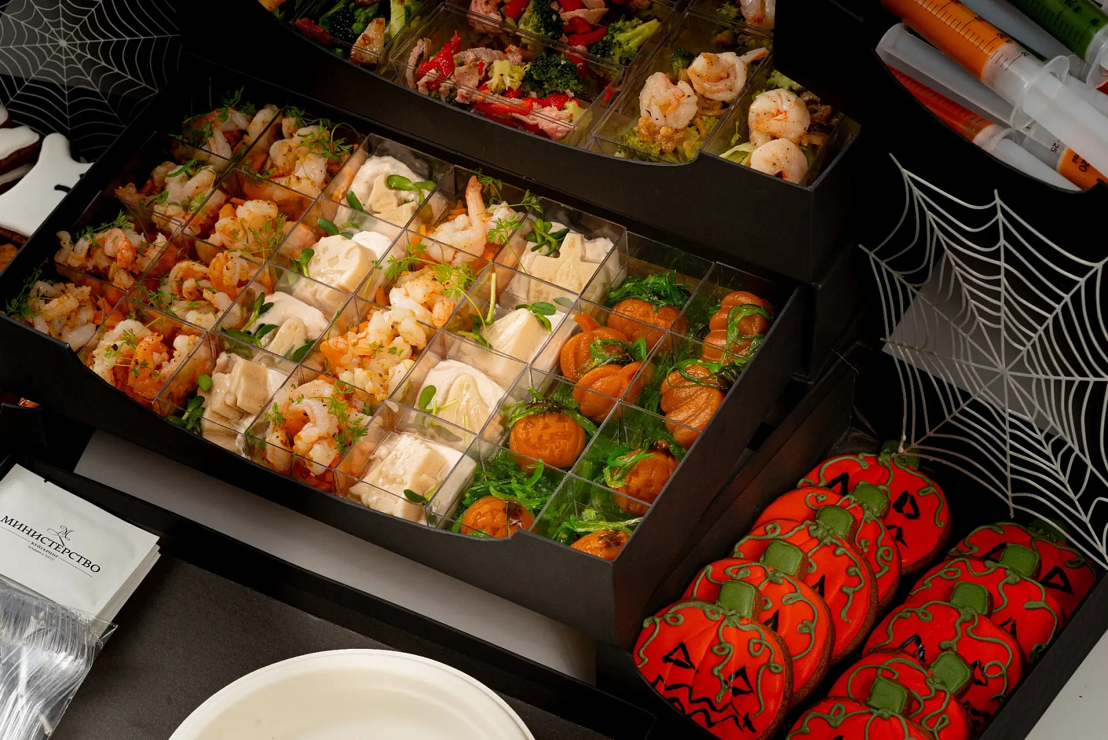 Закуски с креветками, авторские салаты, ассорти верринов, хэллоуинские пряники и «пальцы ведьмы» — всё собрано для создания вау-эффекта. Шприцы с супами придают дополнительную динамику подаче.