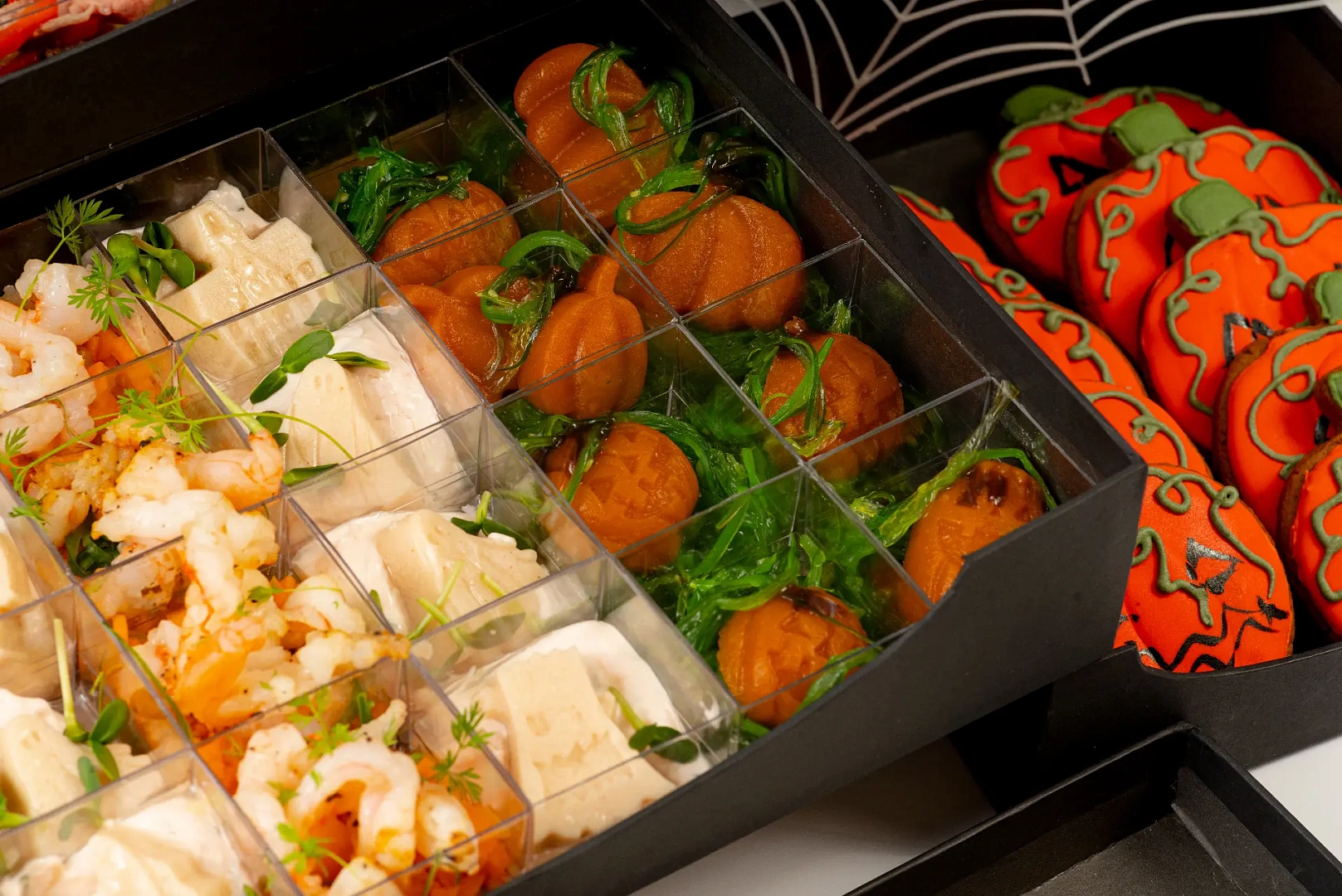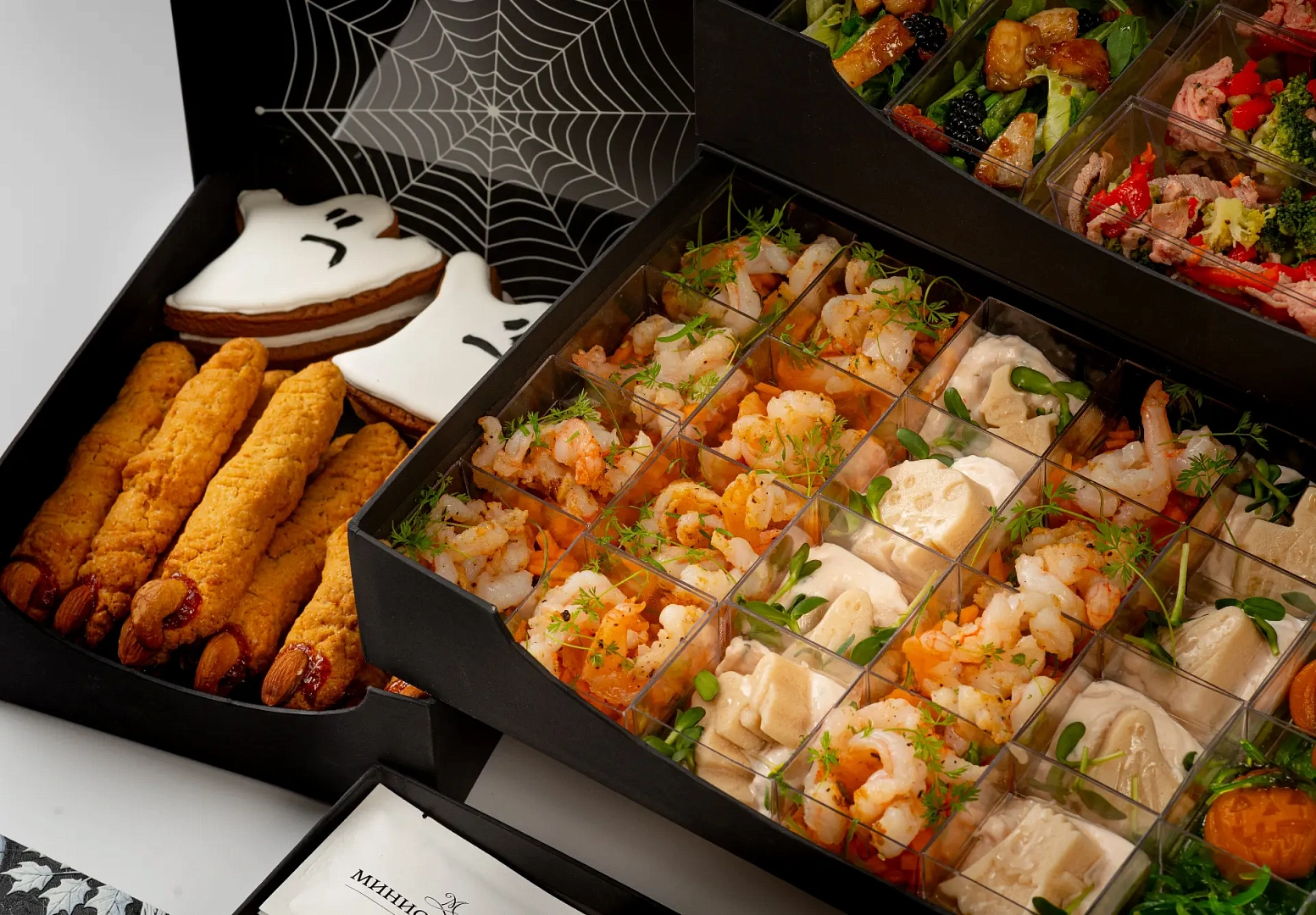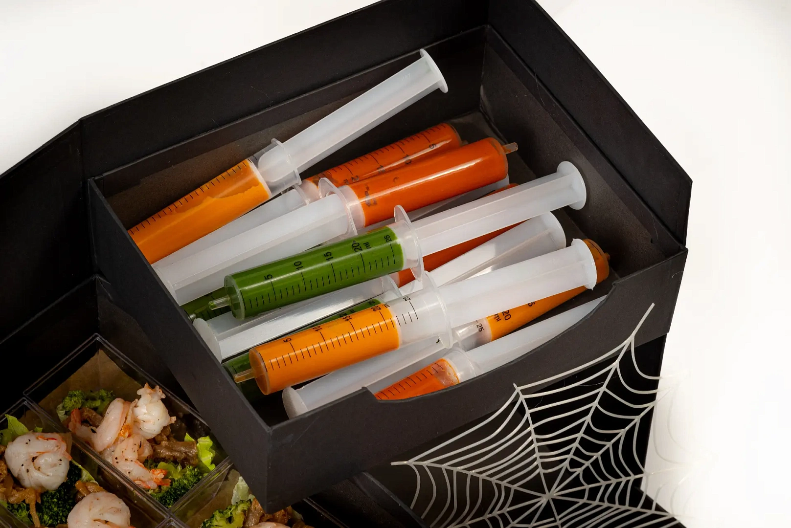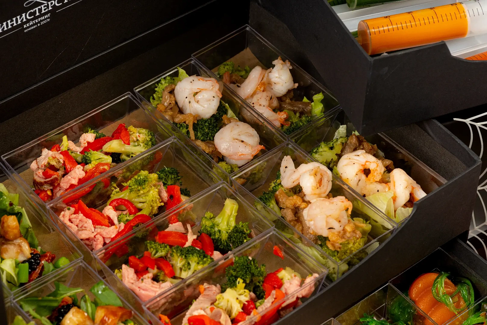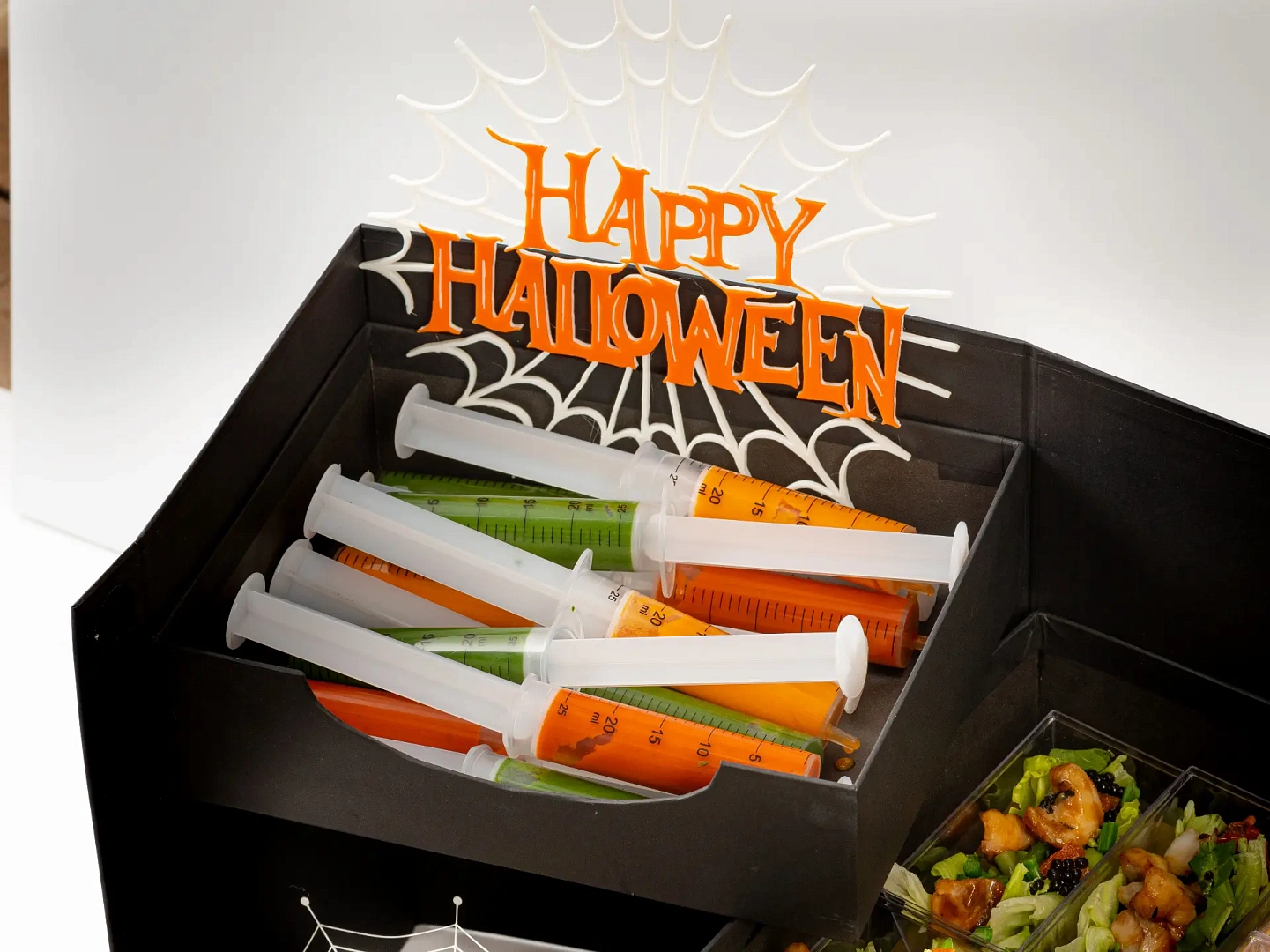 Закуски с креветками, авторские салаты, ассорти верринов, хэллоуинские пряники и «пальцы ведьмы» — всё собрано для создания вау-эффекта. Шприцы с супами придают дополнительную динамику подаче.