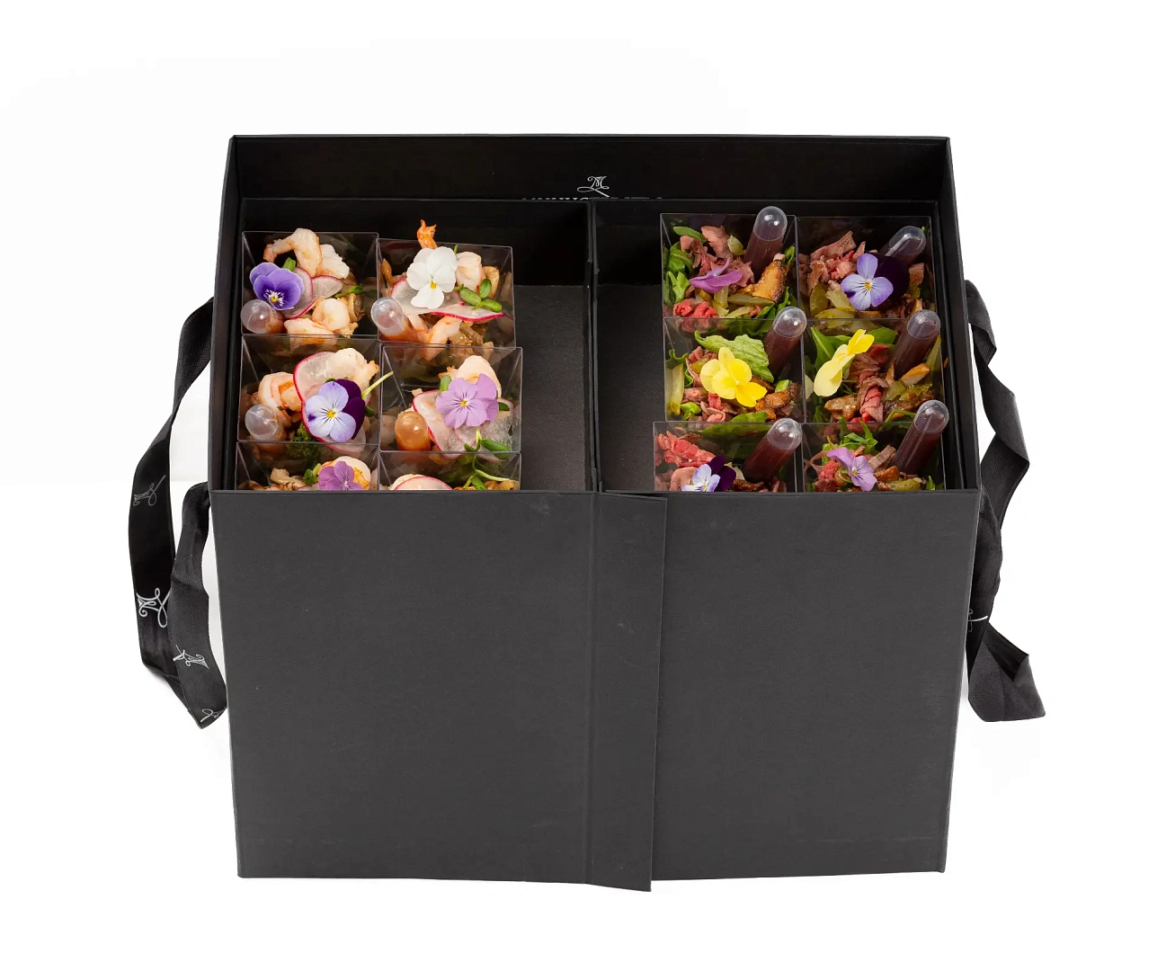Булгаковский сет — это лёгкий мистический аккорд, словно сцена из романа, где за повседневным ужином прячется тайна. В мини-стаканчиках и верринах встречаются неожиданные пары: говядина с грибами, лосось с манго, креветки с овощами. Завершают действие десерты — чизкейк и сметанник с клубникой, будто сладкая послесловица. Упакованный в фирменную коробку-трансформер, этот набор превращает сервировку в маленький спектакль, где каждый гость вовлекается в игру вкусов.