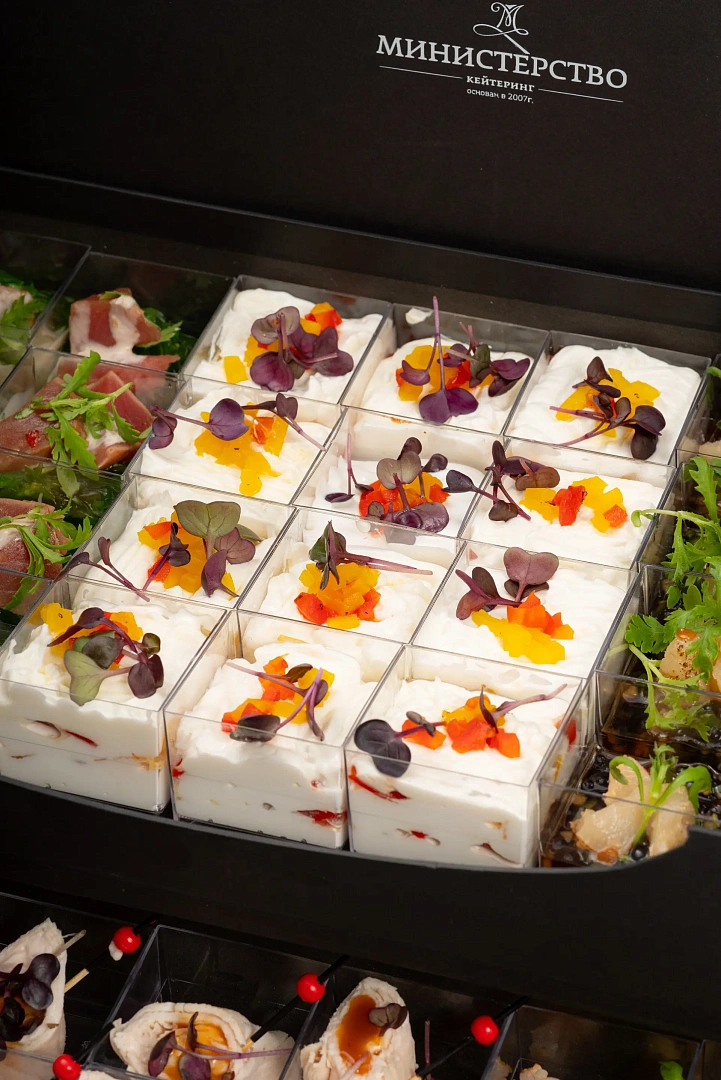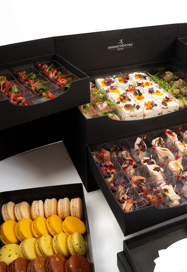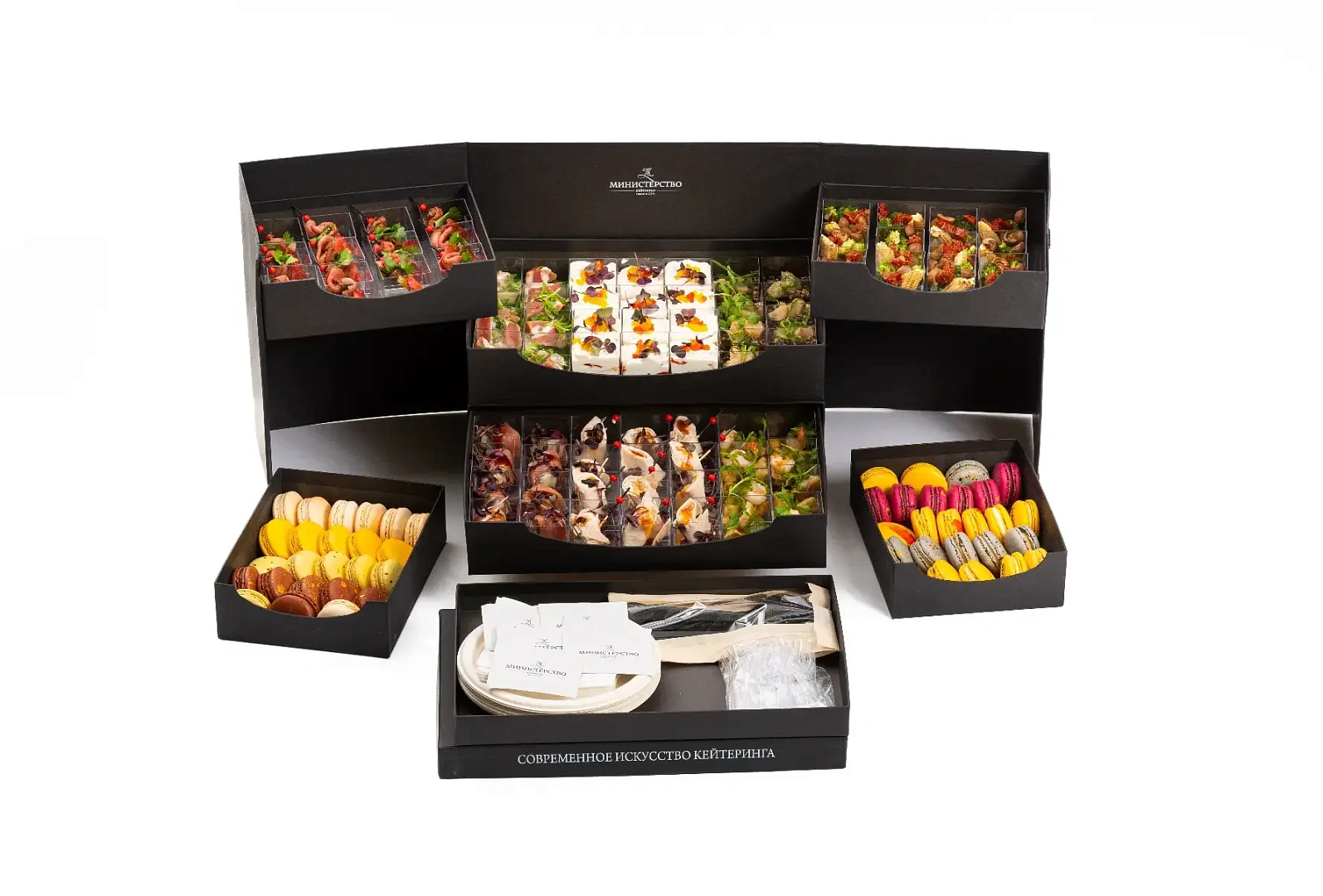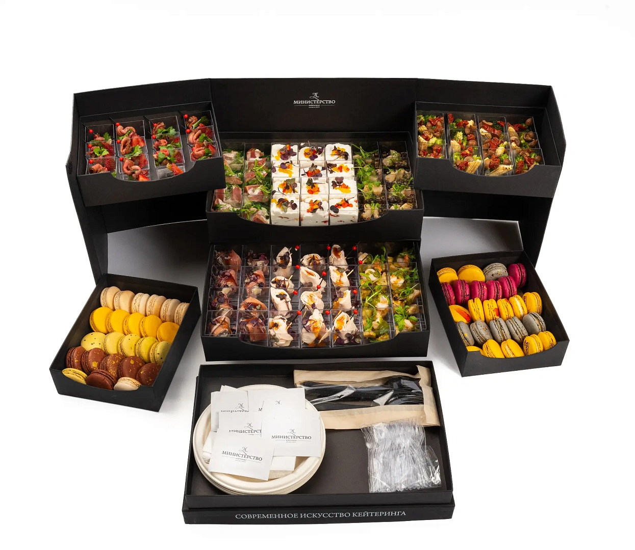 Изысканная коллекция, собранная для торжественных событий. Закуски-веррины становятся «картинами в миниатюре»: хамон с камамбером, тунец с чука, гребешок с икрой, креветки и куриные рулетики в лемонграссе. Канапе с телятиной, клубникой и имбирным мармеладом добавляют неожиданный штрих, как сказочный персонаж на полотне. А десерт «Макарон» завершает историю нежным цветным акцентом. Такой набор словно сказочное полотно, созданное, чтобы восхищать.