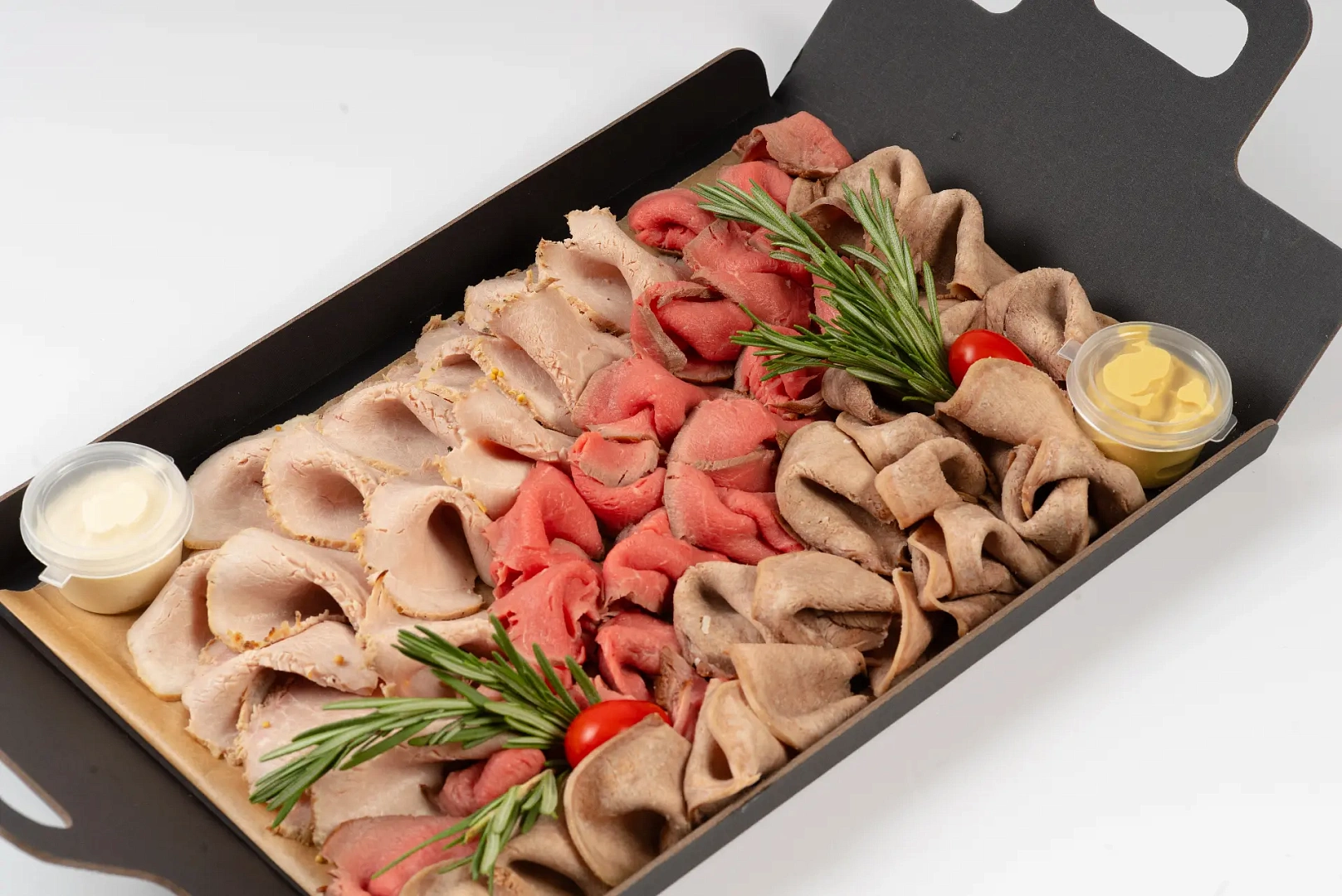 Ростбиф из говяжьей вырезки, буженина из свинины, отварной говяжий язык, хрен сливочный, фриллис