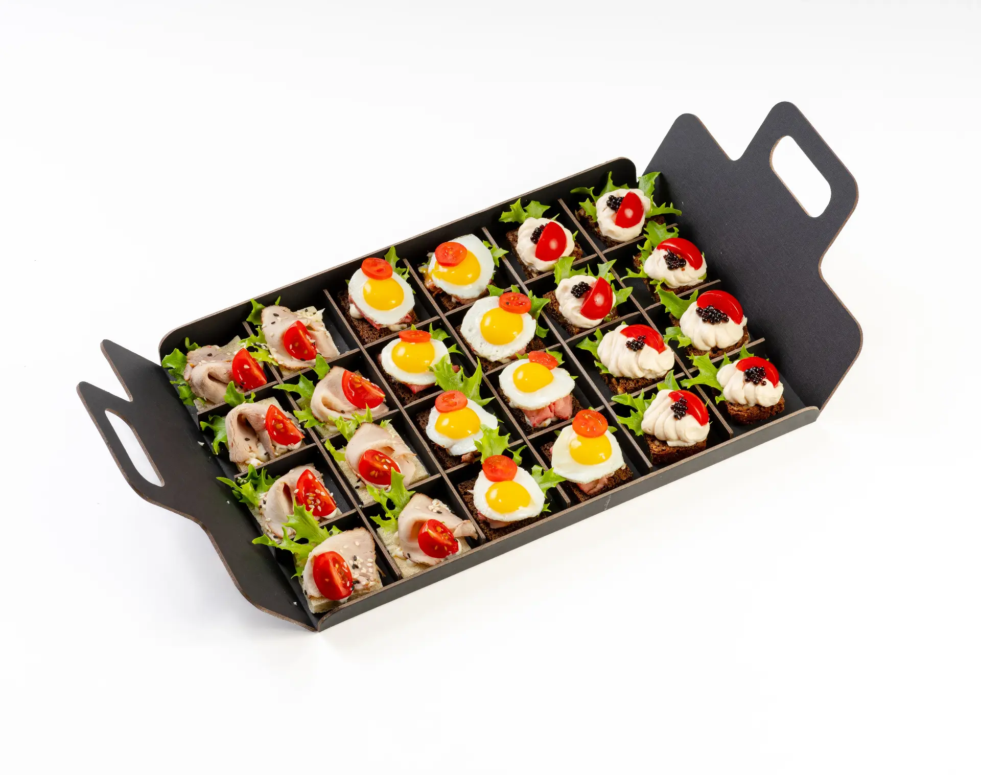 Снежный краб, креветка и сельдь с яйцом складываются в игривую композицию — дерзкую и непредсказуемую, как сцена гоголевской комедии. Отличный выбор для веселых ярких праздников.