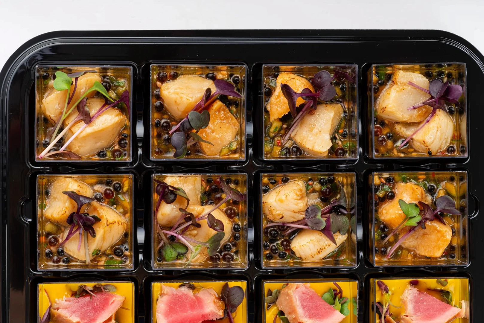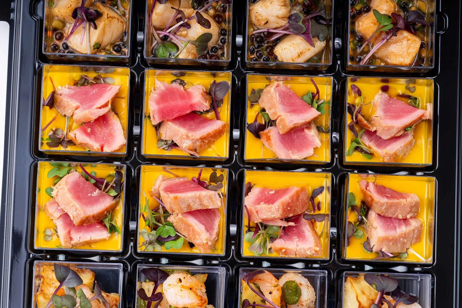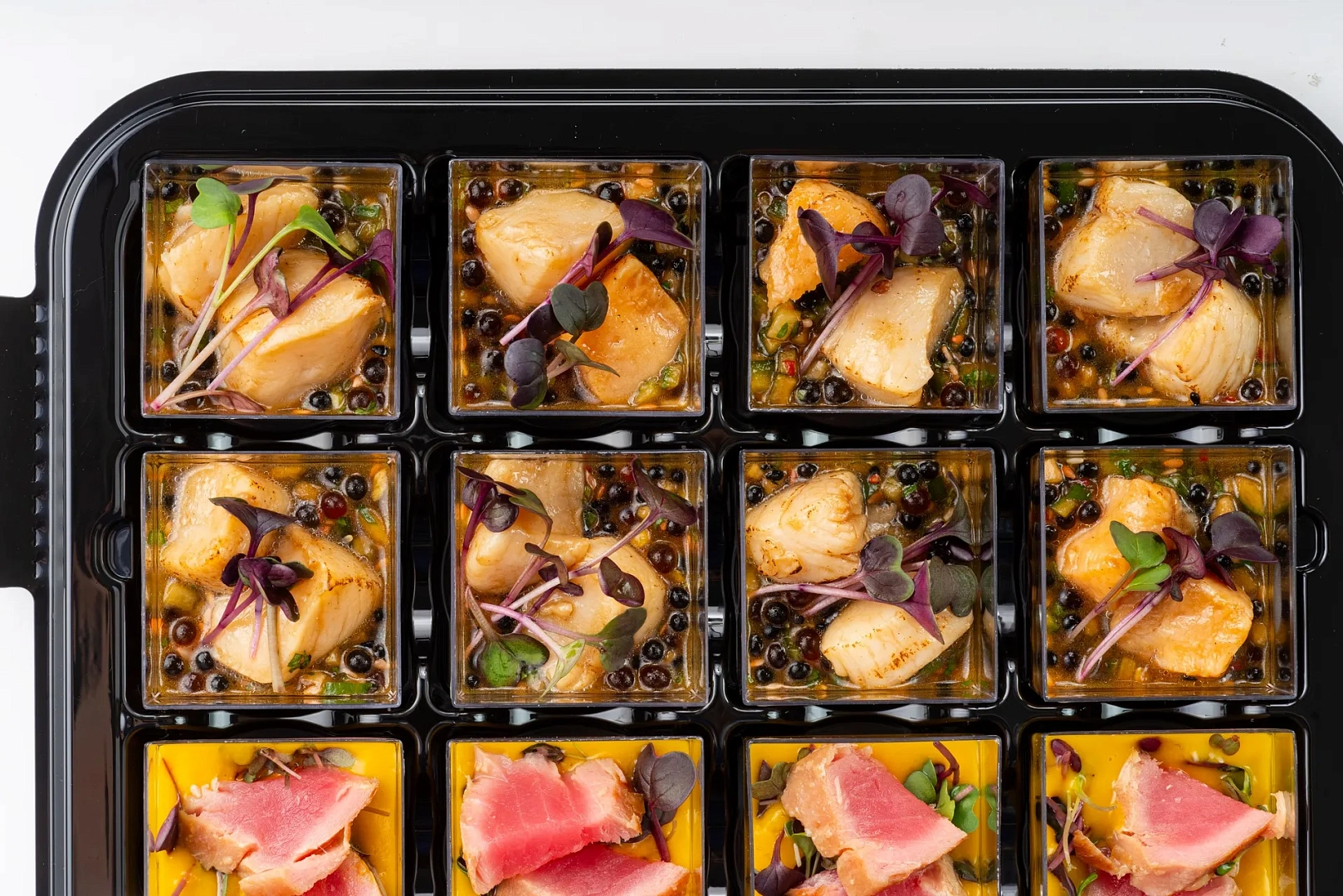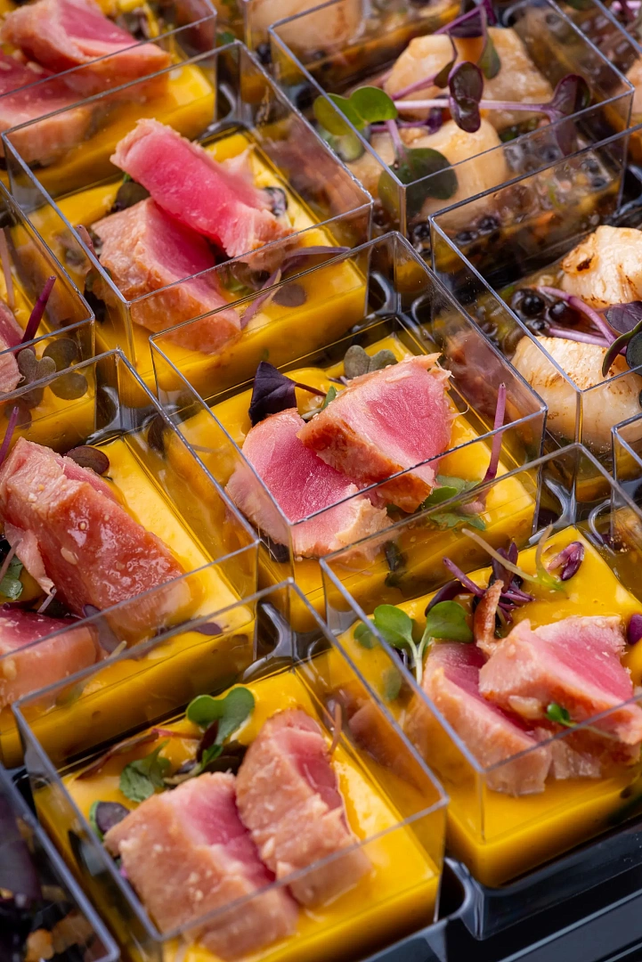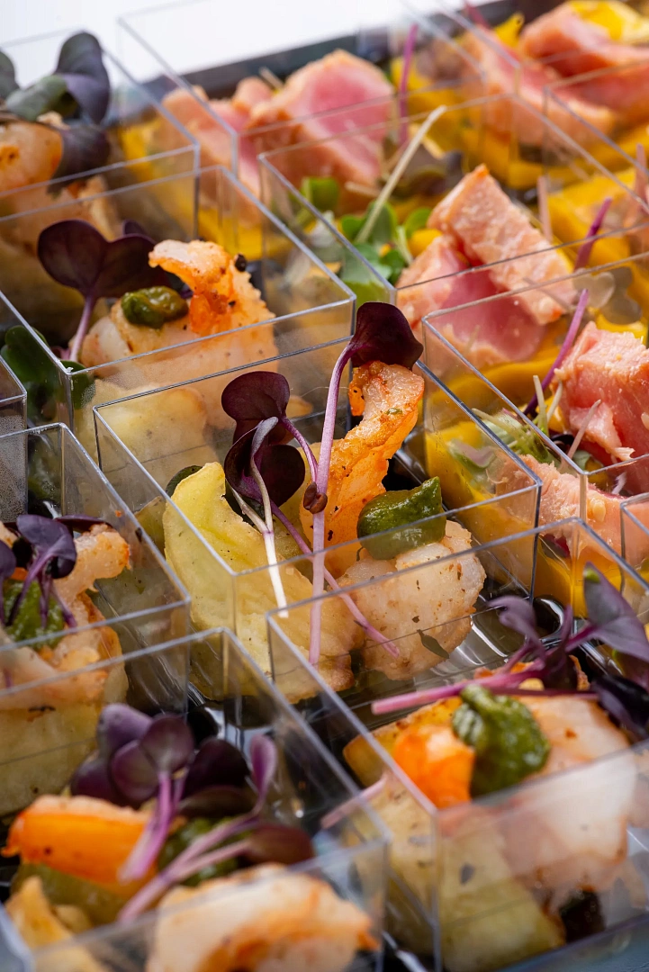 Гребешок, тунец и тигровые креветки образуют морскую симфонию — мощную, свежую и благородную. Идеально для гастрономических вечеров и сетов к шампанскому.
