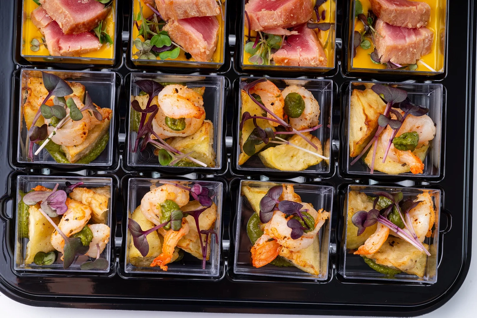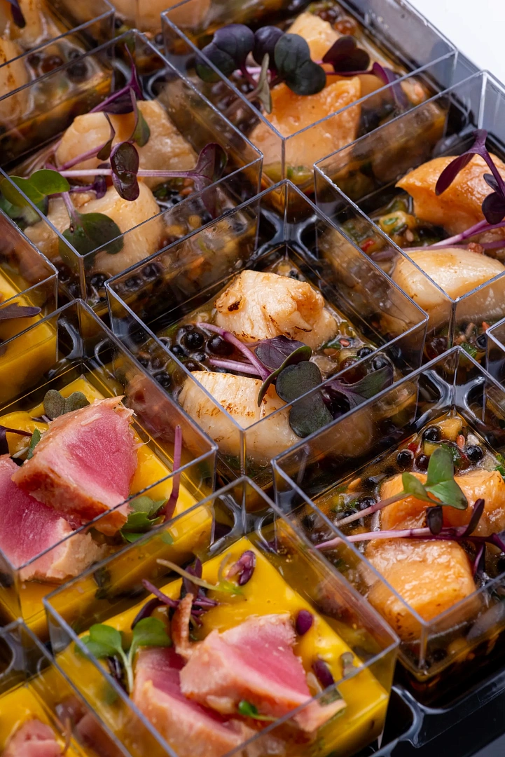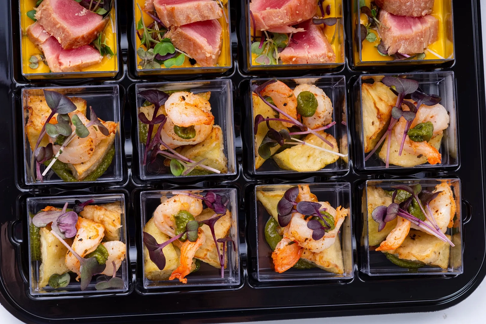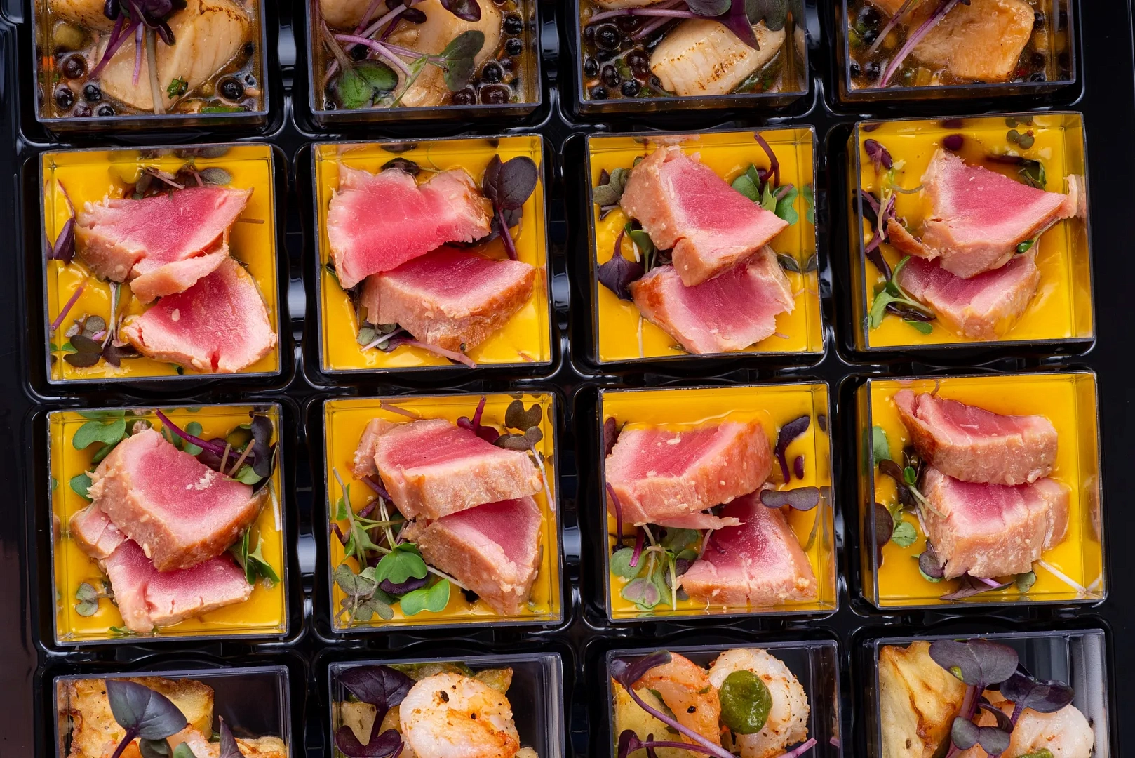 Гребешок, тунец и тигровые креветки образуют морскую симфонию — мощную, свежую и благородную. Идеально для гастрономических вечеров и сетов к шампанскому.