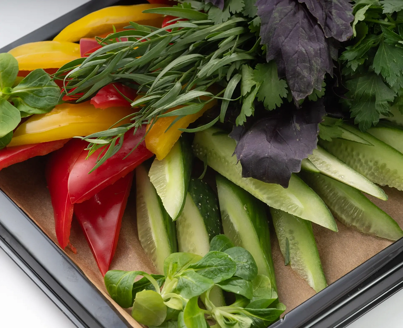 Овощное Плато (томаты черри на ветке, сладкий перец, огурец свежий, бакинская зелень(базилик красный, эстрагон, кинза, мята)