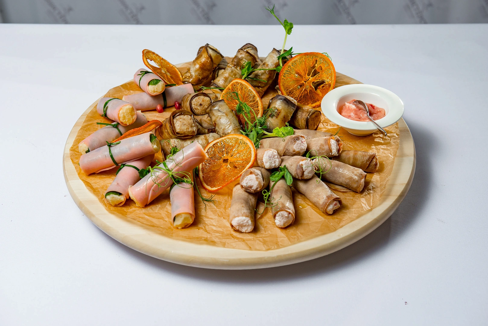 Каннеллони из баклажанов с сыром и с ореховой пастой. рулетики из ветчины с сыром и роллы из языка с творожным муссом