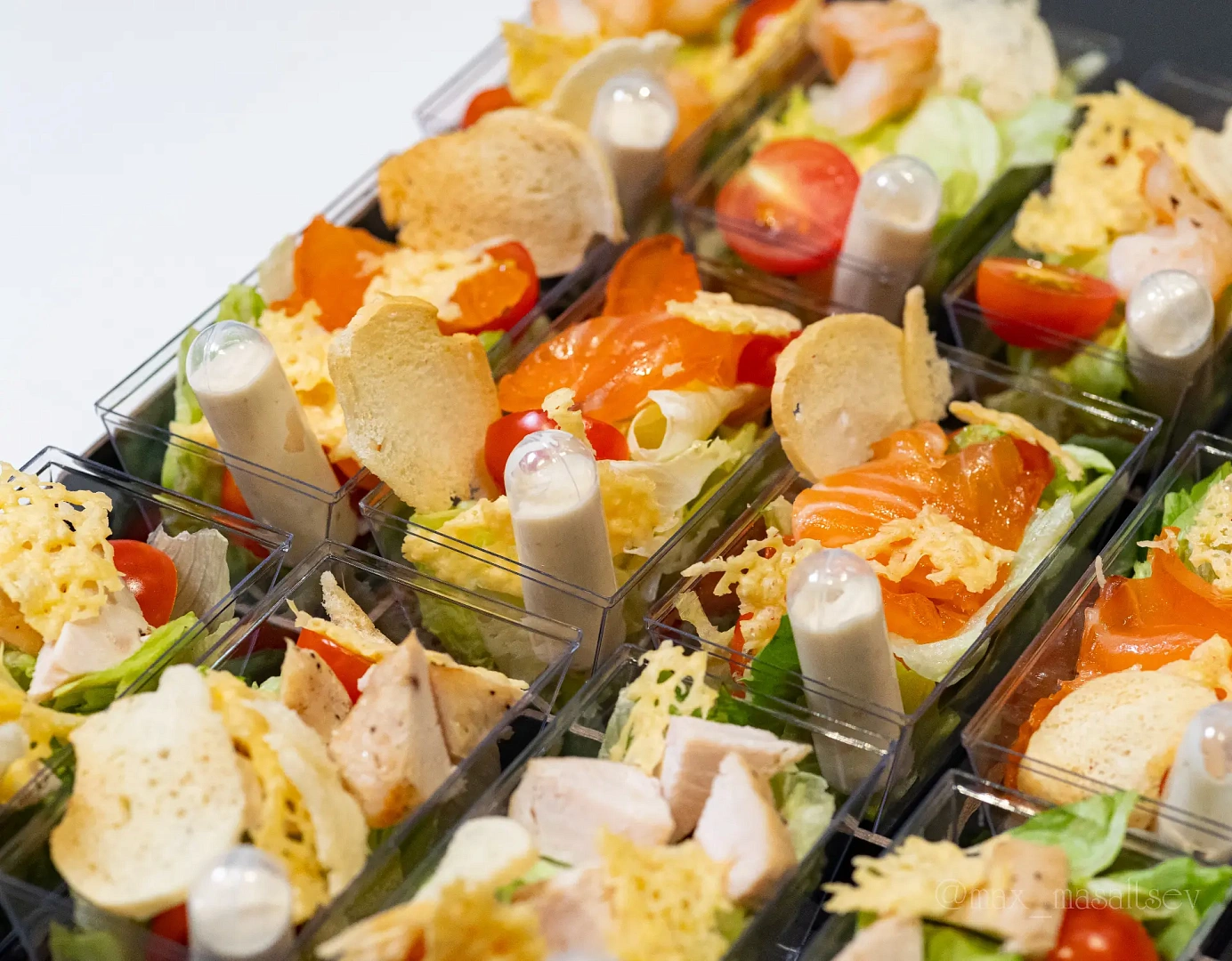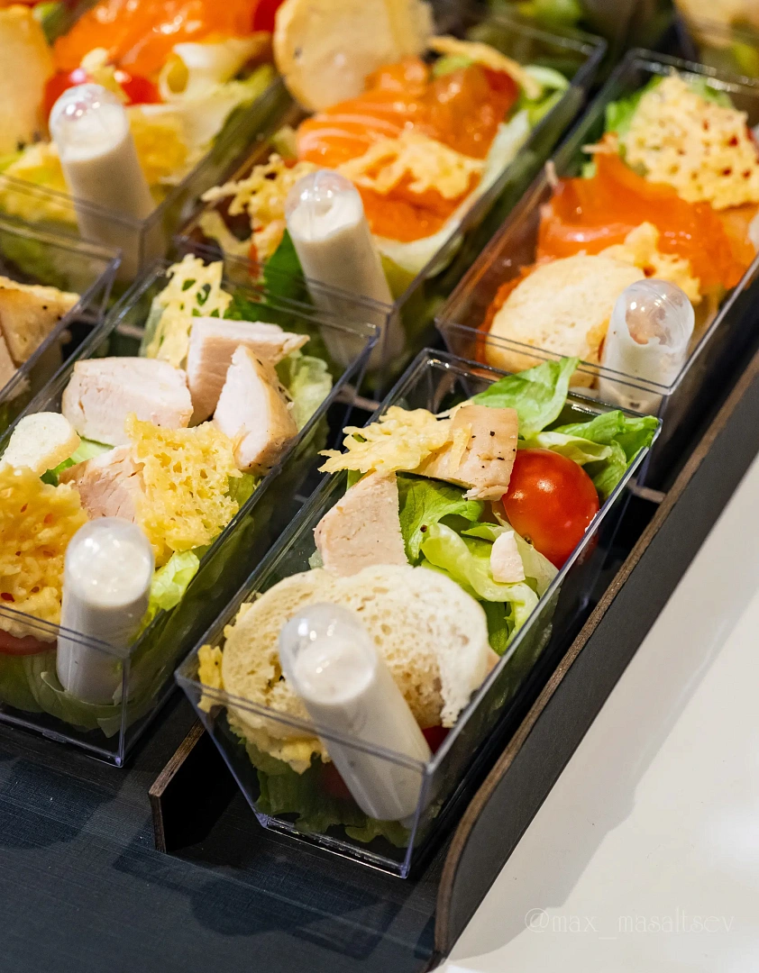 В салатах соус уже добавлен на дно стаканчика - перед подачей просто перемешайте ингредиенты для гармоничного вкуса.