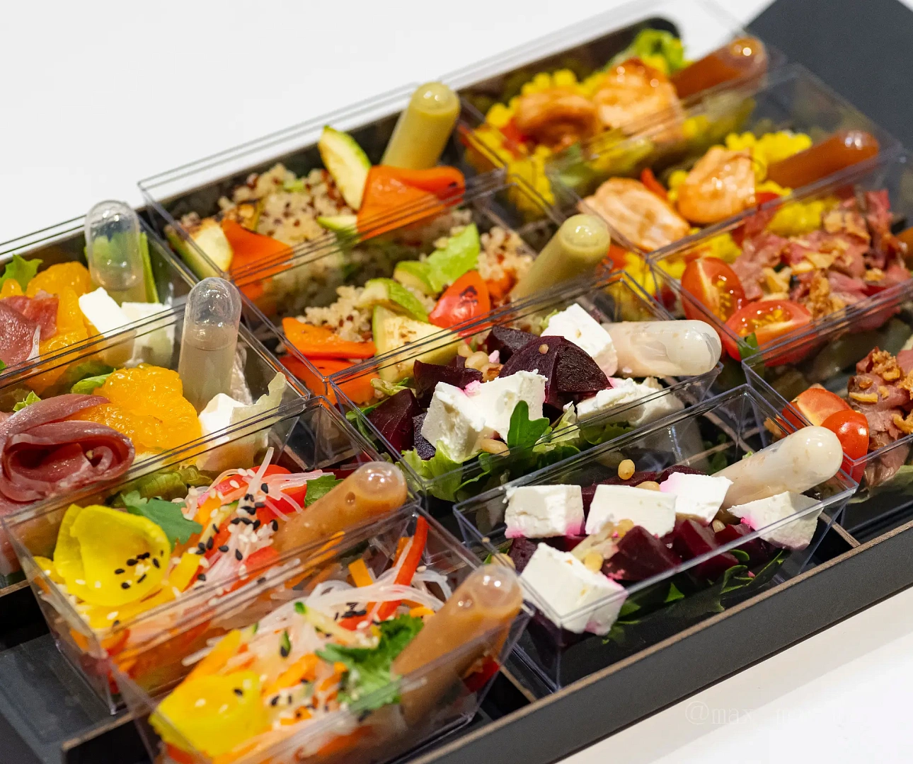 Лосось с птитимом, свёкла с фетой, утка с фетой, фунчоза, говядина с картофелем и овощи с киноа складываются в яркий калейдоскоп, напоминающий кубистическое полотно Пикассо. Идеальное решение, если хочется удивить гостей необычной палитрой вкусов и изысканным визуалом.